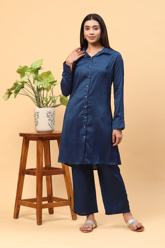 Pihu Prussian Blue Collared Kurta Palazzo Set