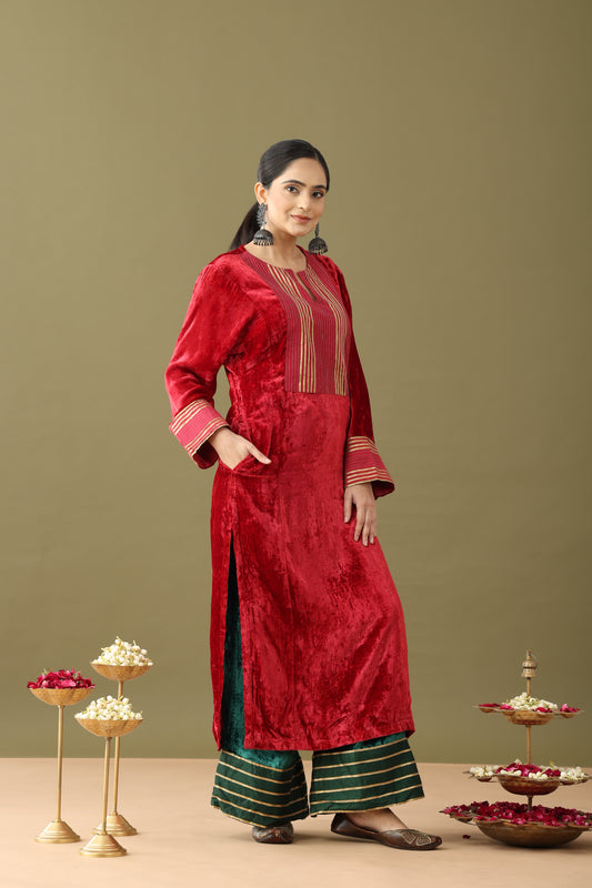 Utsaah Red And Green Velvet Gotta Kurta Set