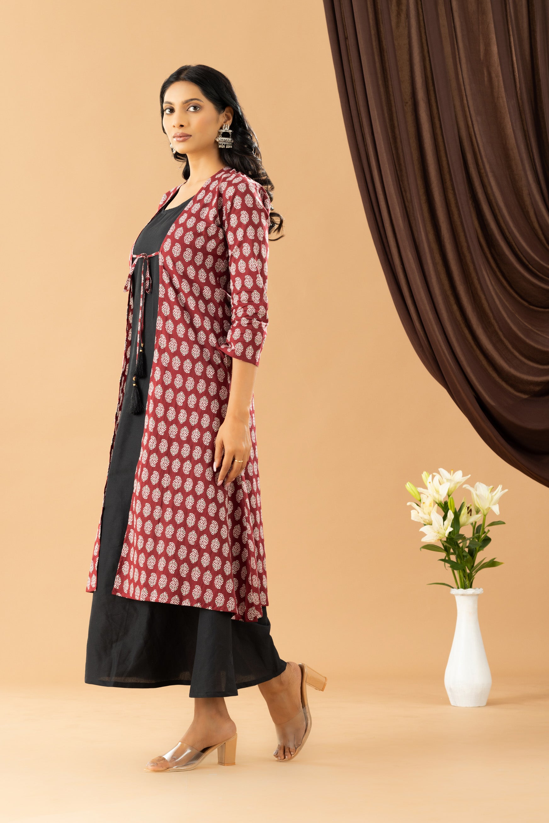 Berry Block Print Shrug Dress. This two-piece set featuring round neck and a three-fourth sleeves is designed to infuse your wardrobe with the timeless charm of Block-printed patterns. Rendered in soft cambric cotton fabric, the set offers a graceful silhouette that seamlessly merges comfort with sophistication. The front tie-up string adds sophistication and style to the overall design, introducing traditional designs with a modern twist.
