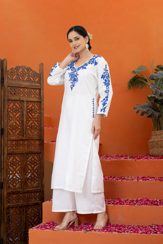 Jugni White Indigo Embroidered Phiran Set