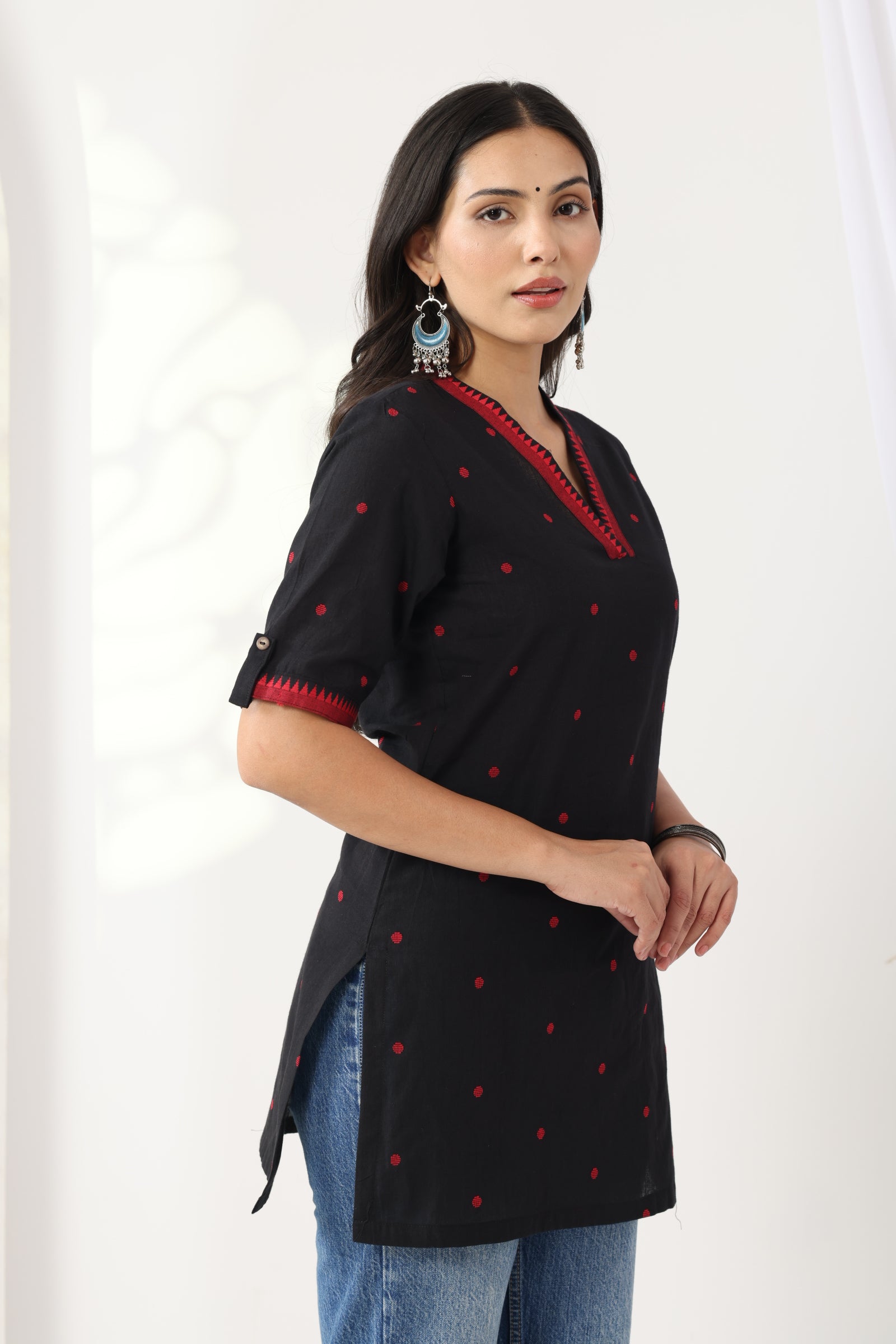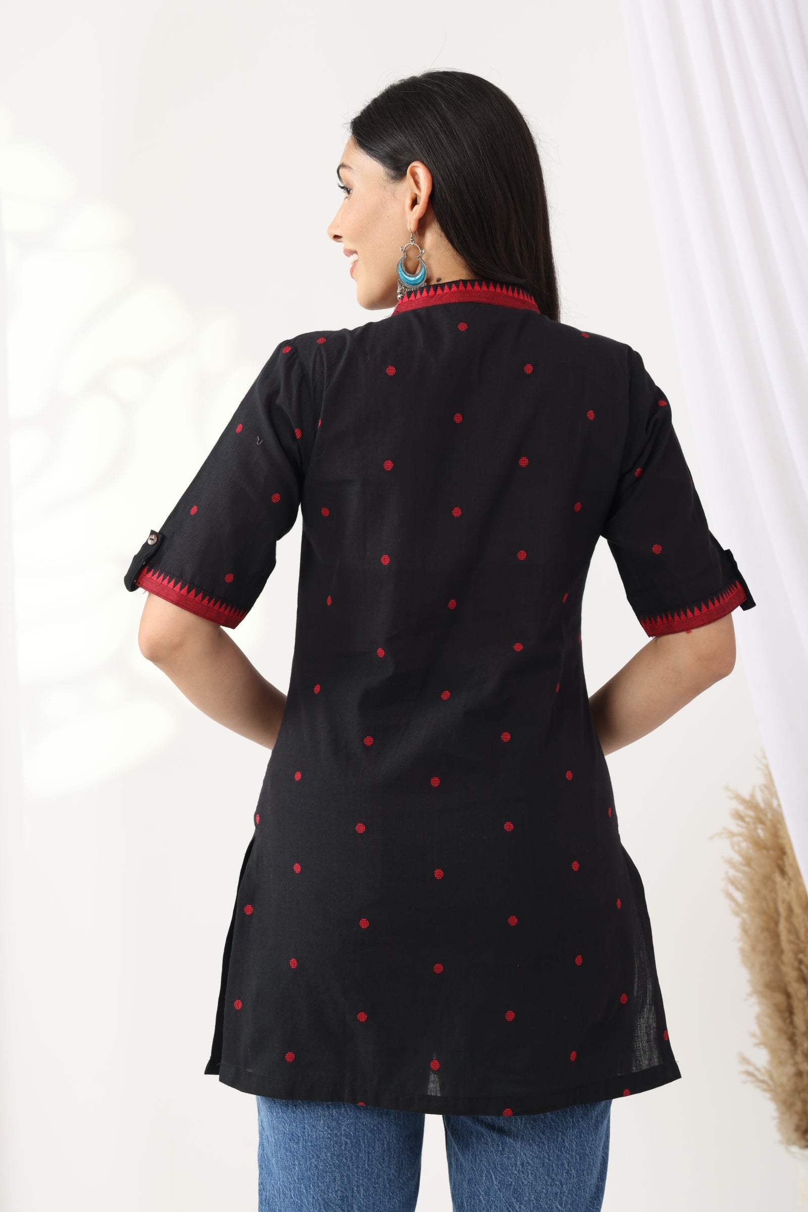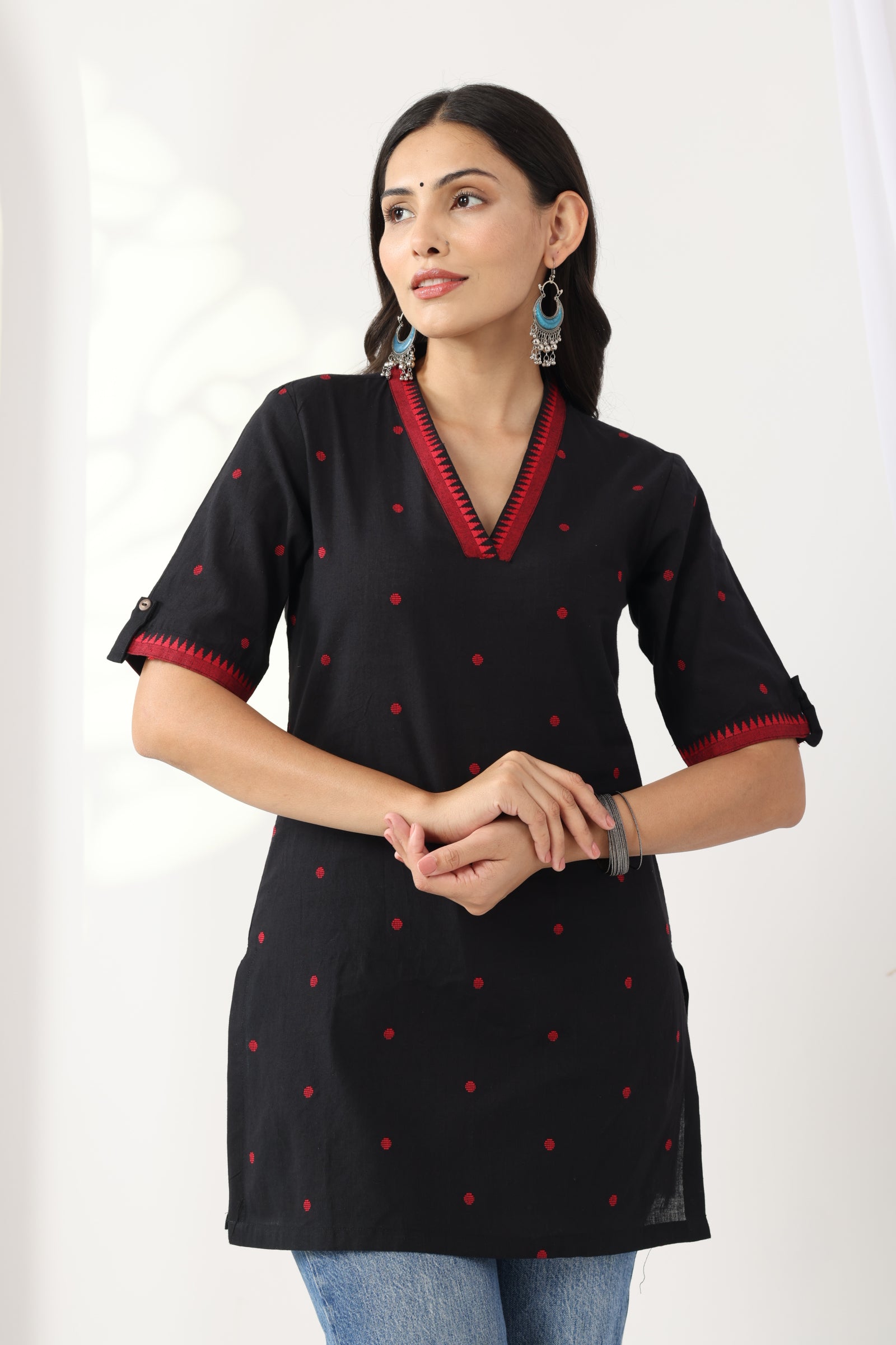 A refined essential for your everyday wardrobe, this black V-neck tunic blends tradition with a crisp, formal silhouette. Crafted in breathable cotton, it features subtle red Jamdani motifs delicately woven into the fabric. With elbow length sleeves, deep side slits for ease, and contrast detailing on the neckline and cuffs, this piece is a nod to understated elegance — perfect for work hours or slow weekends alike.