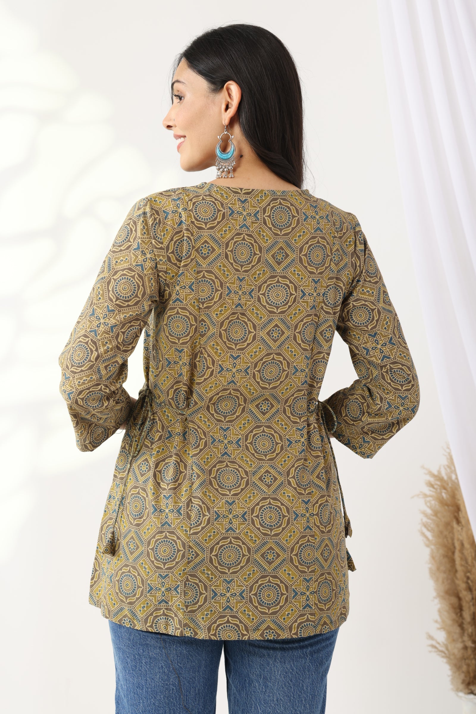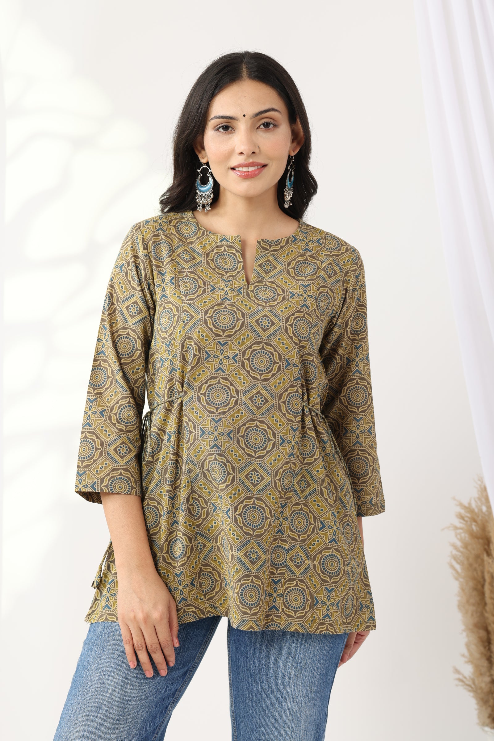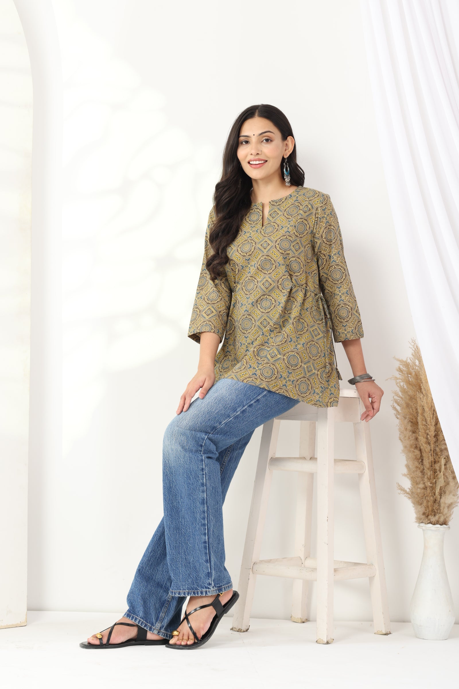 Rooted in earthy tones and effortless elegance, this Ajrakh print kurti is crafted from breathable cambric cotton — soft against the skin and ideal for all-day comfort. The silhouette is relaxed, featuring a notched neckline, 3/4th sleeves, and subtle side tie-up doris along the waist that create a gentle cinched effect. Designed to blend ease with artisanal charm, this is a piece you’ll reach for again and again.