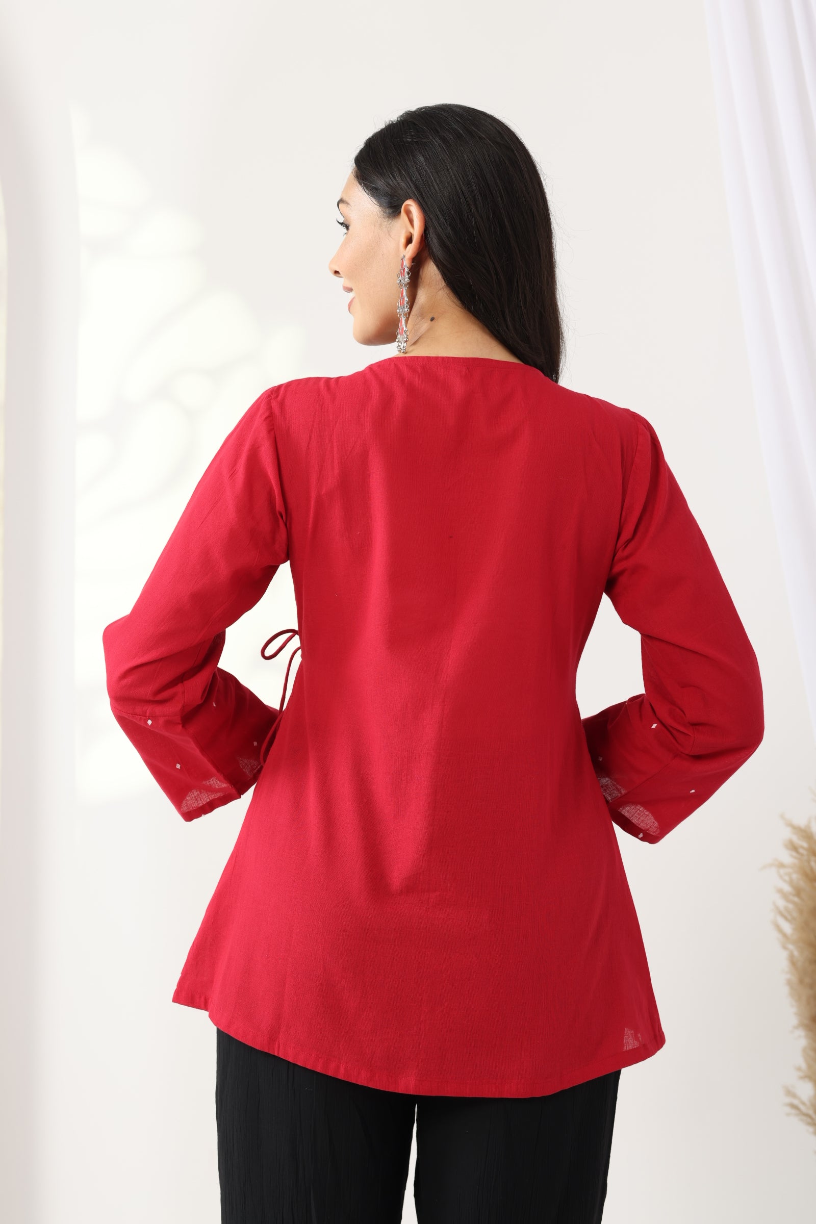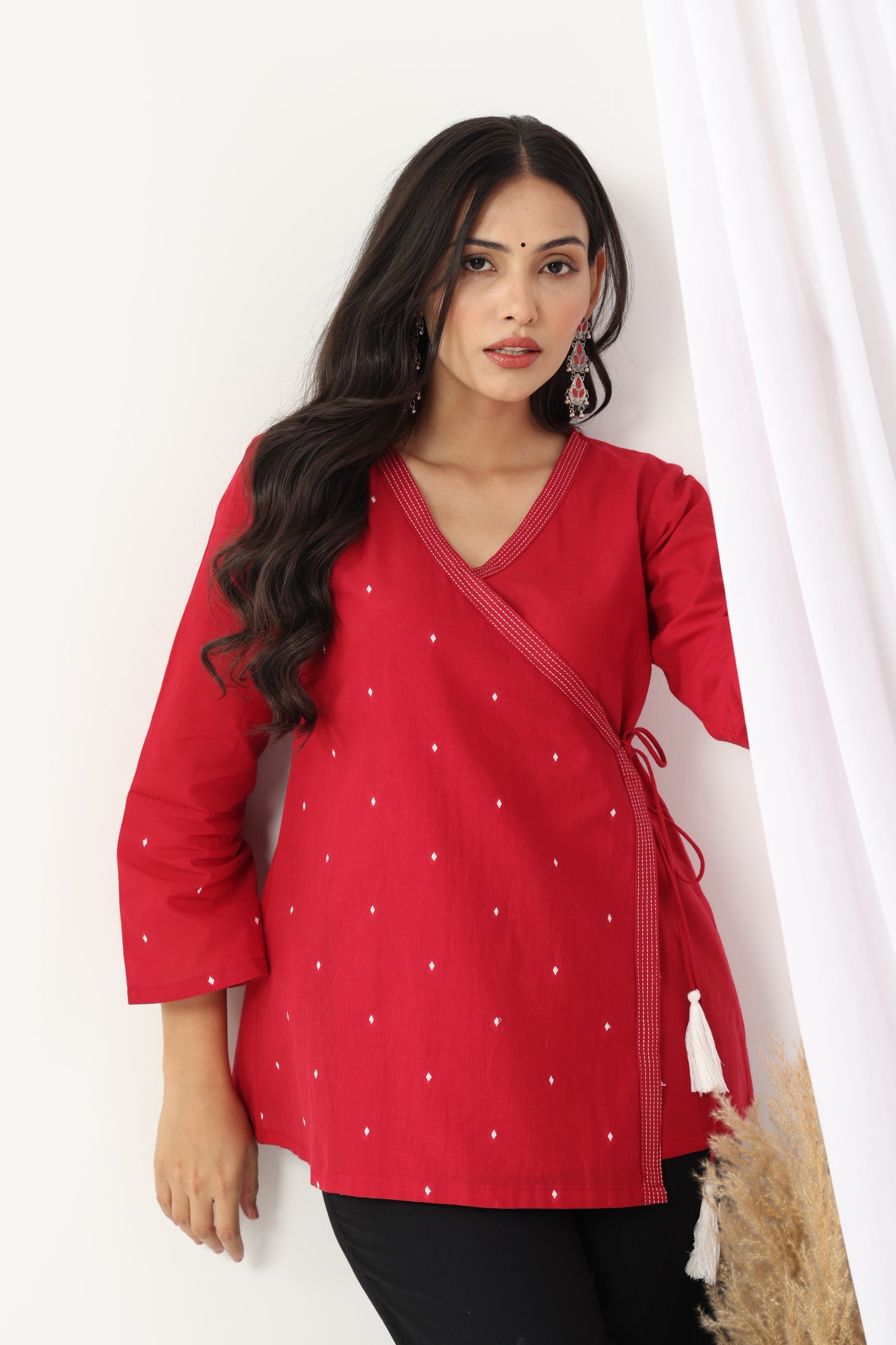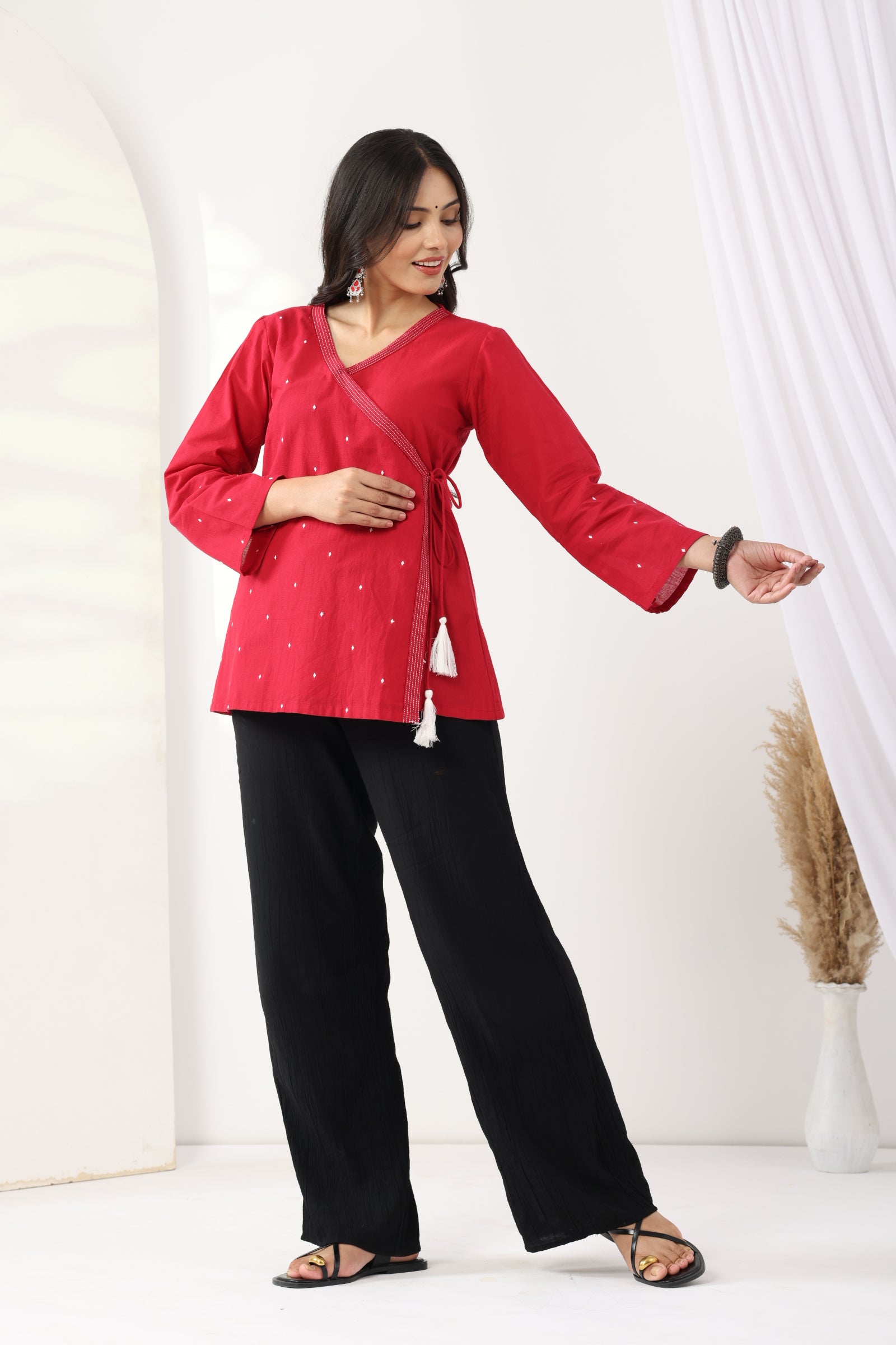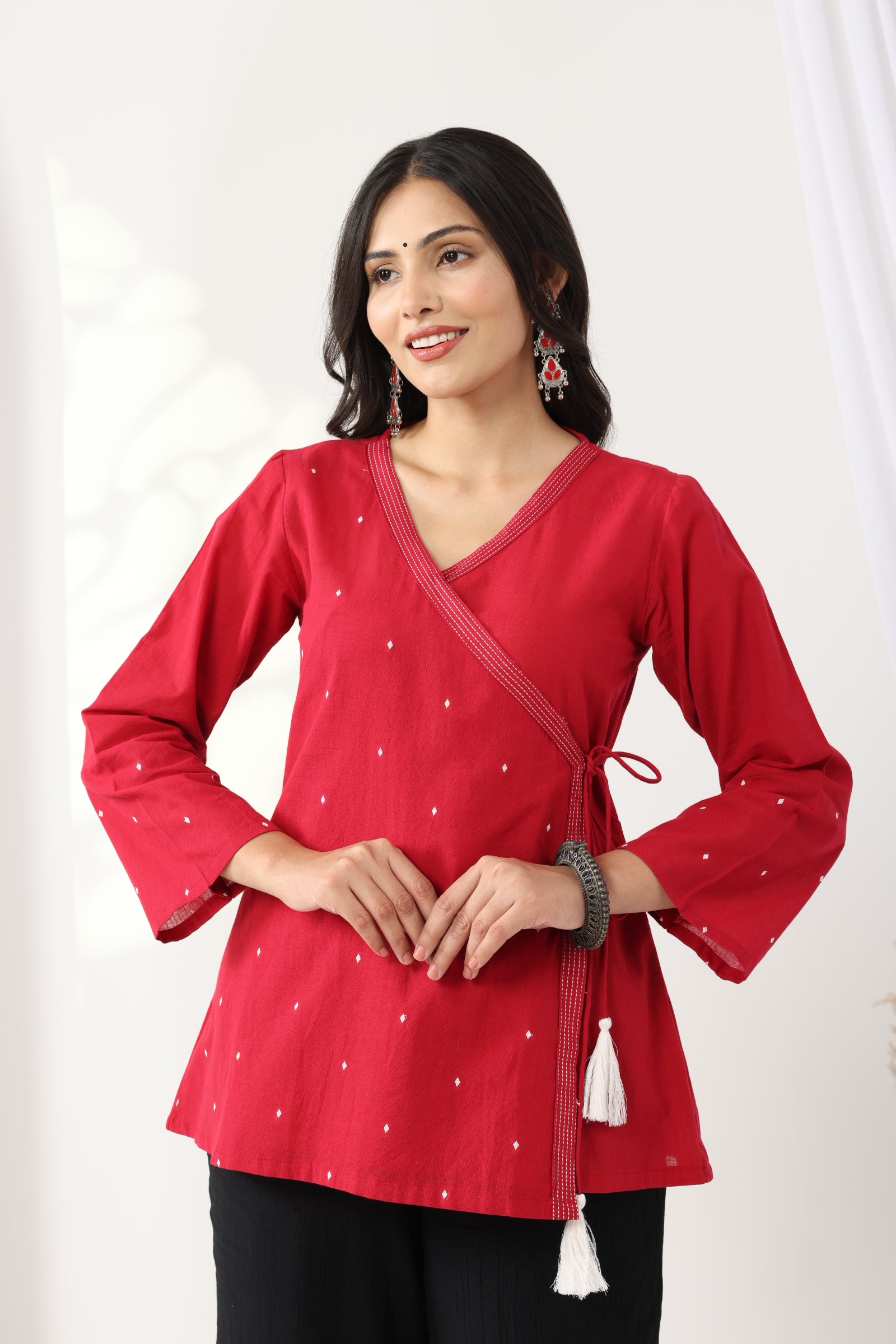 Effortlessly elegant, this Jamdani kurta is a celebration of comfort and understated charm. Designed in a rich red hue, it features a graceful angrakha-style V-neckline with an open panel and side tie-up dori adorned with tassels. The relaxed fit and 3/4th bell sleeves make it ideal for all-day wear — from morning meetings to evening strolls. Tailored for ease and movement, this piece is as versatile as it is timeless.