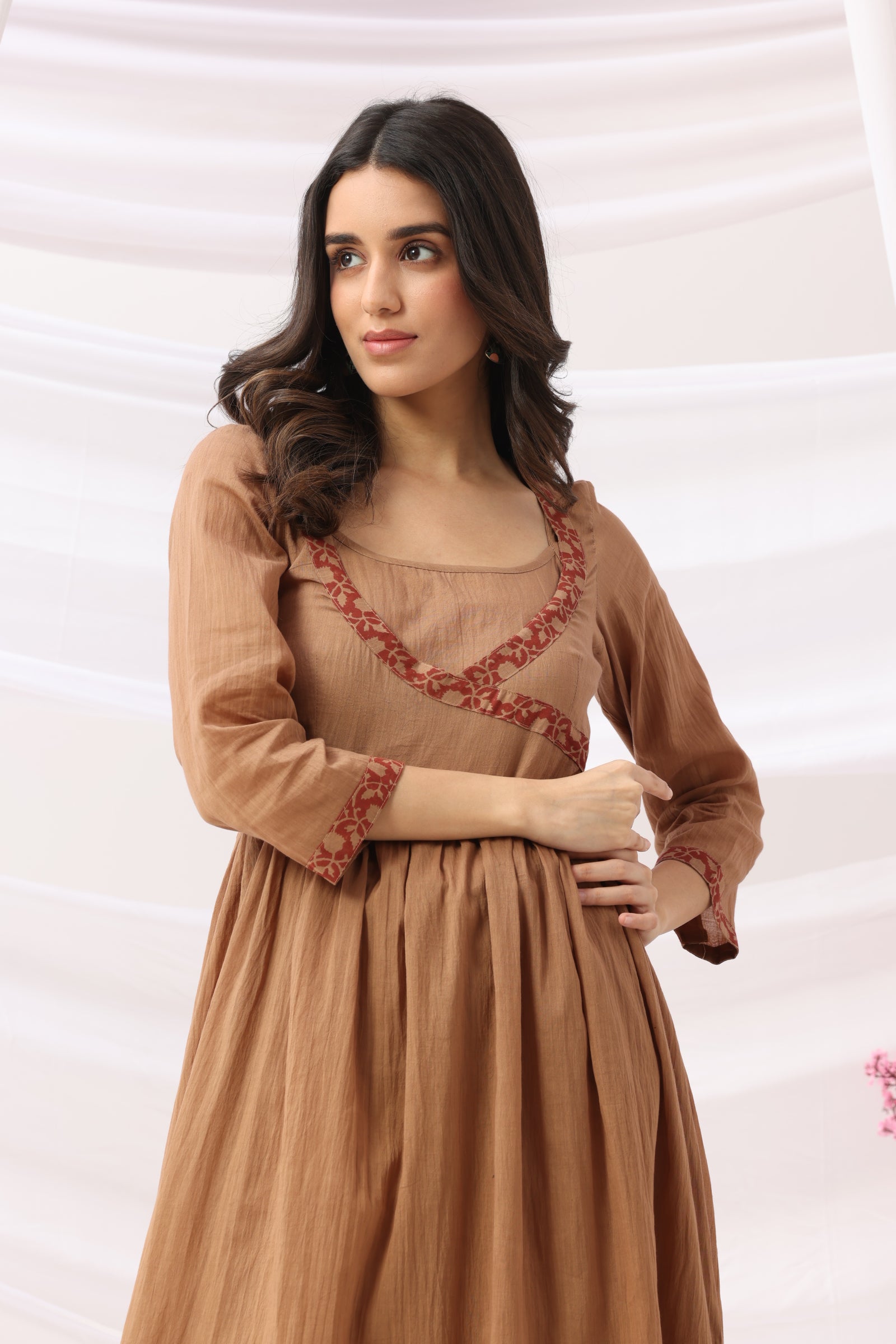 Intricate hand-block prints decorate the rich mud-brown fabric, adding depth and artisanal character to the garment. The graceful design reflects the beauty of a handcrafted cotton angrakha kurti, while the premium Cotton Cambric fabric ensures breathability and structure, making it an ideal everyday luxury outfit.