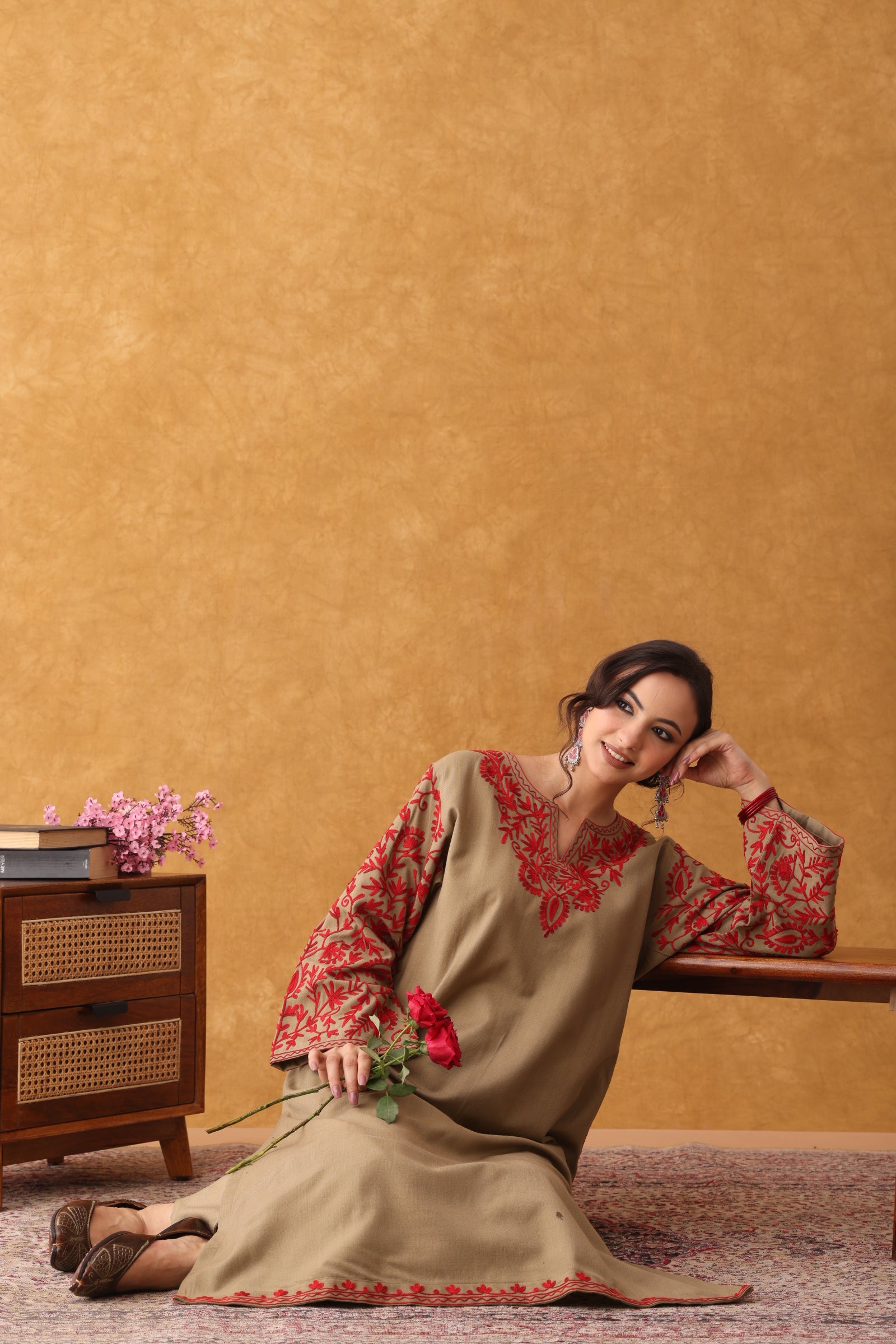 Embrace understated elegance with this chic khaki/taupe kurta and palazzo set, beautifully contrasted with bold crimson red embroidery. This outfit features a sophisticated color palette and distinctive sleeve detailing, making it ideal for semi-formal events and seasonal gatherings.