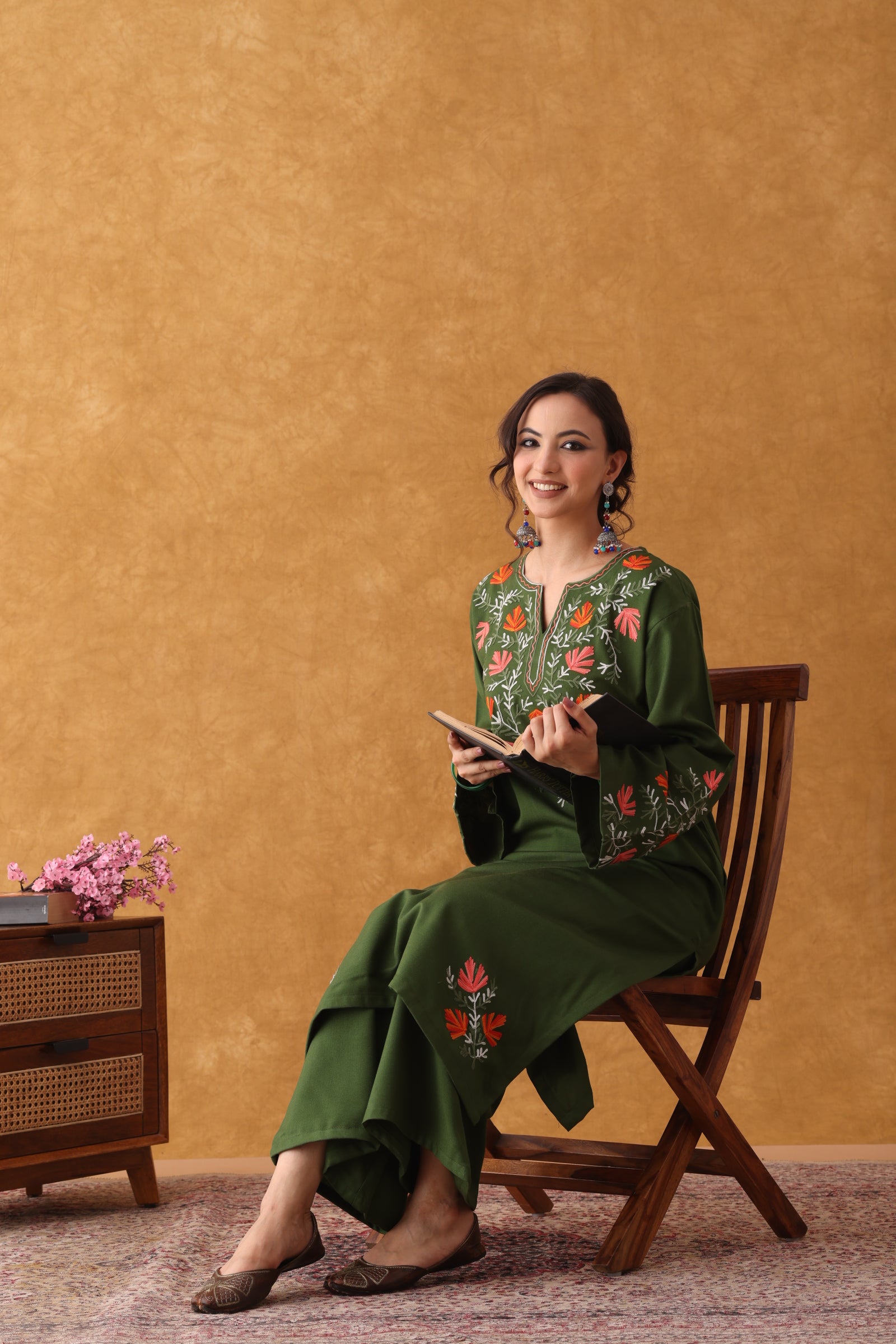 Palazzo Pants: The set includes comfortable, wide-leg palazzo pants in the matching olive green color, ensuring a cohesive look and comfortable movement. The relaxed fit complements the straight structure of the kurta. Wash & Care - Gentle machine wash with similar colors. Do not bleach or soak. Tumble dry low. Warm iron inside out.