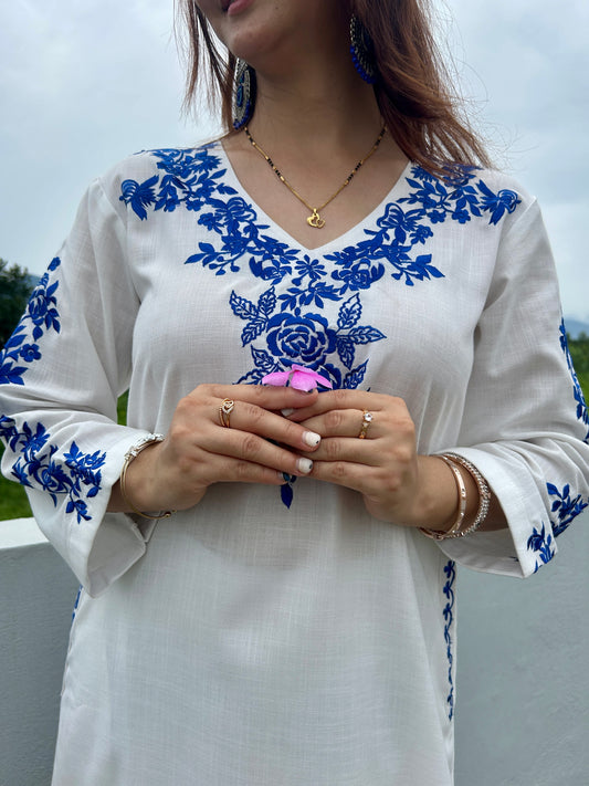 Sleeves: Full-length sleeves elegantly embellished with floral embroidery, with cuffs mirroring the intricate collar details for a cohesive look