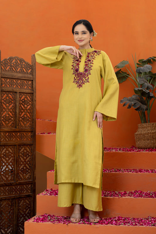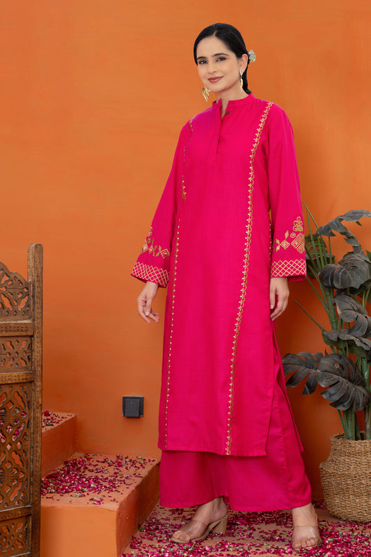 The Saadgi Burnt Brick Embroidered Kurta Set from Handikart is meticulously crafted, making it a perfect choice for your festive wardrobe. A standout among summer suits for women, this breathable cotton slub ensemble offers all-day comfort while radiating graceful allure.