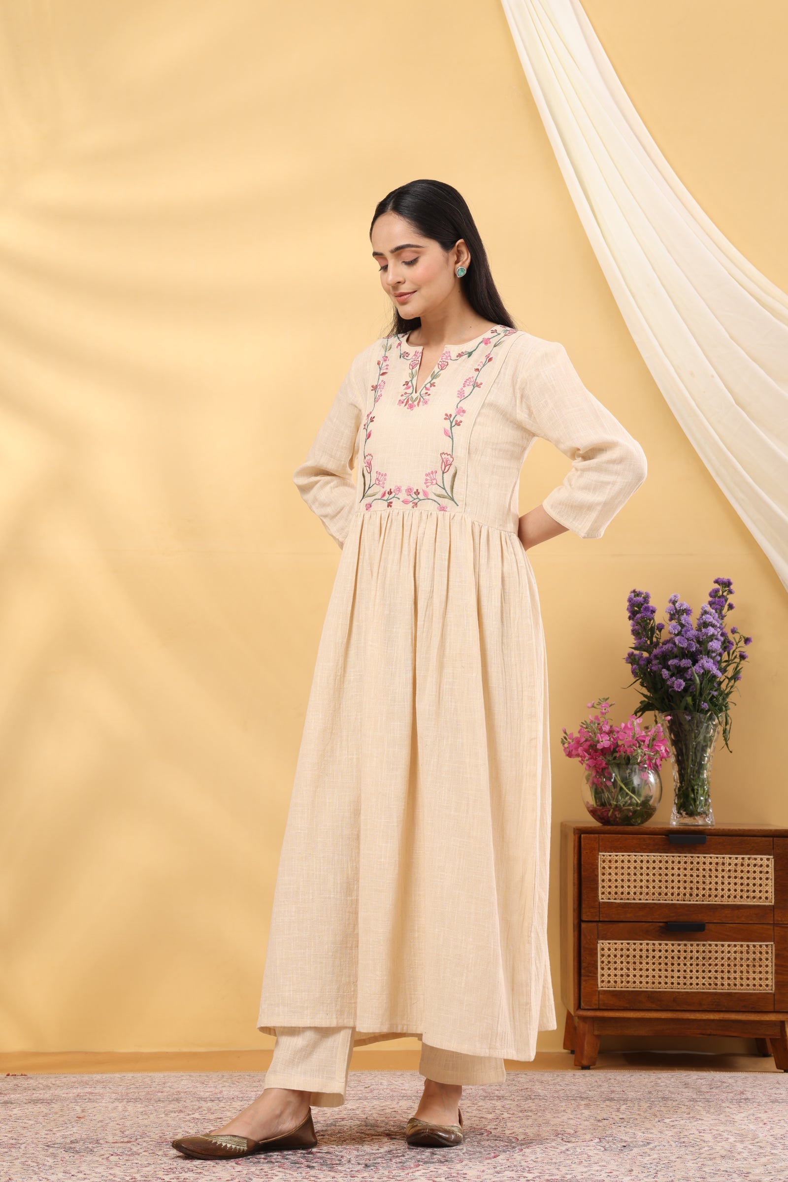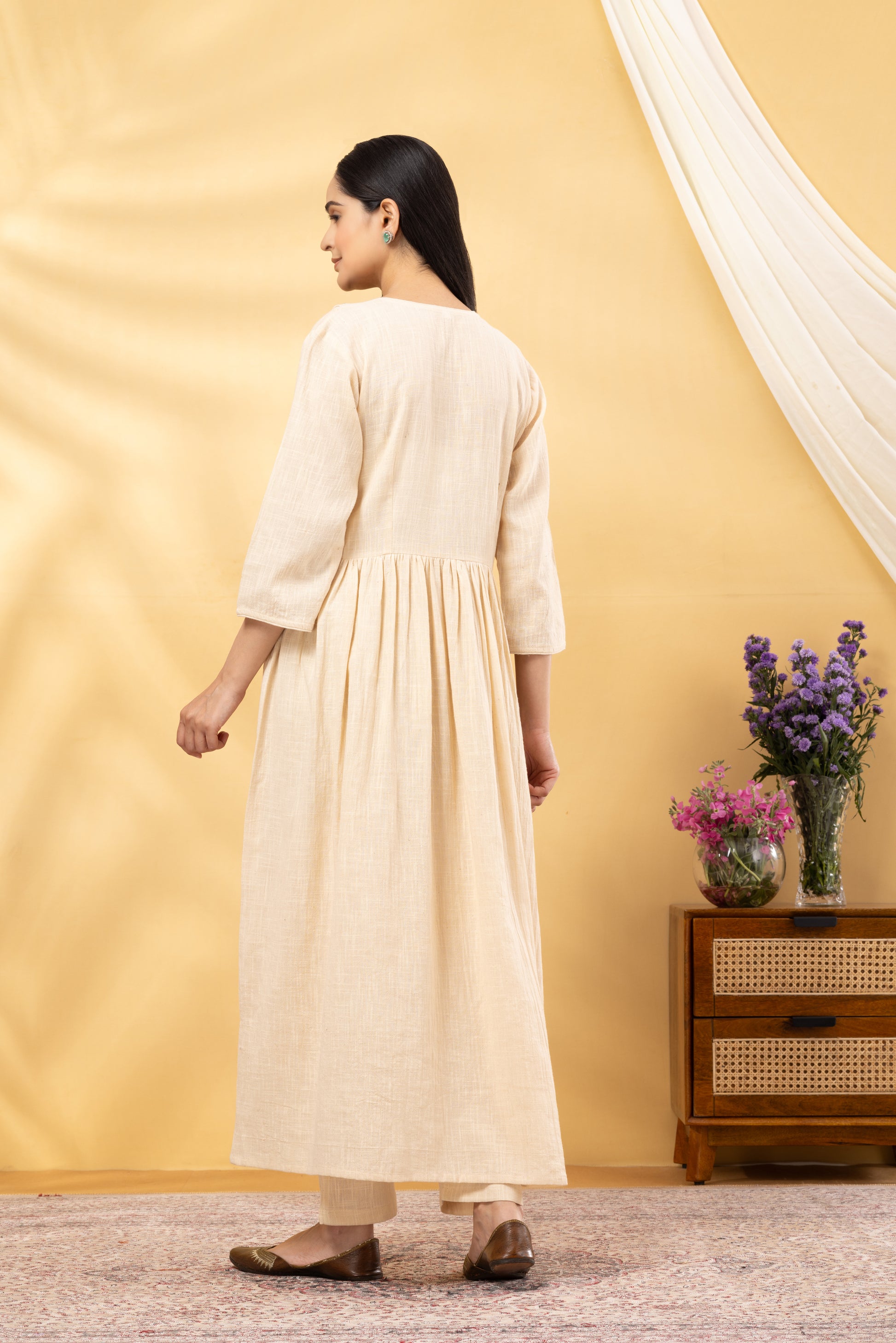 The Saadgi Oat White Kurta Set is perfect for those seeking a sophisticated yet simple style, making it an elegant addition to summer suits for women. Crafted from soft, breathable cotton slub fabric, this ensemble ensures lasting comfort while radiating understated charm.