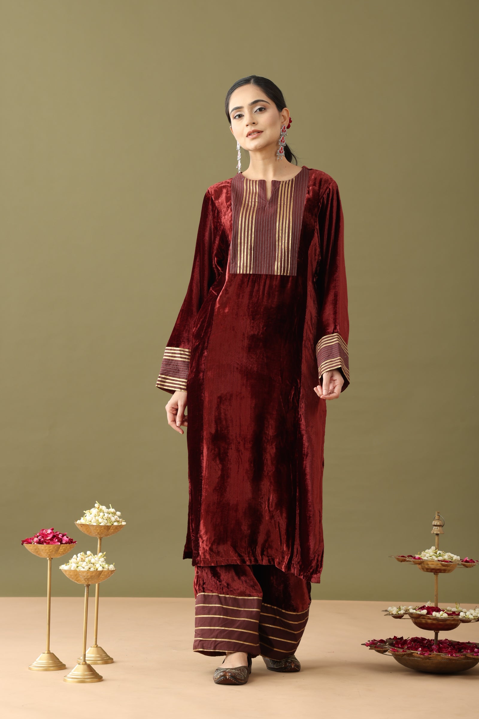 This Brick brown velvet kurta and palazzo set is all about polished perfection. Luxuriously soft velvet in a rich brown hue embraces grace, while intricate gold detailing adds a touch of opulence. Elevate your style with this regal ensemble, a perfect blend of sophistication and allure. The kurta has a modest notched neckline and full length bell sleeves with gold accents along the cuff and structured yoke. Paired with flared palazzos adorned with gota details along the hem.