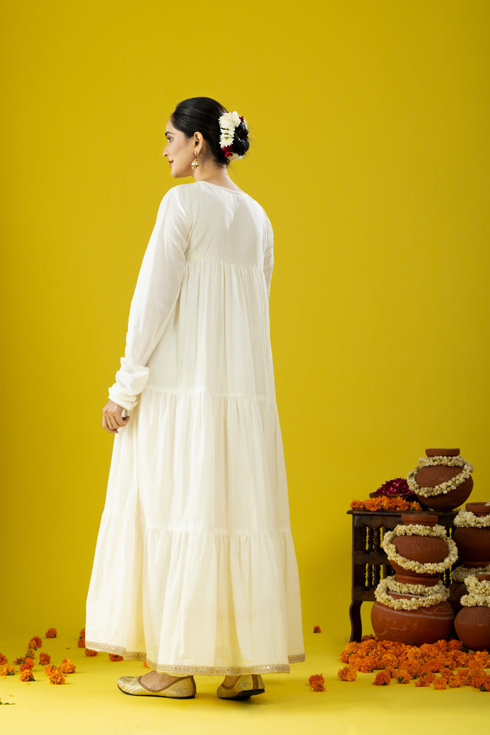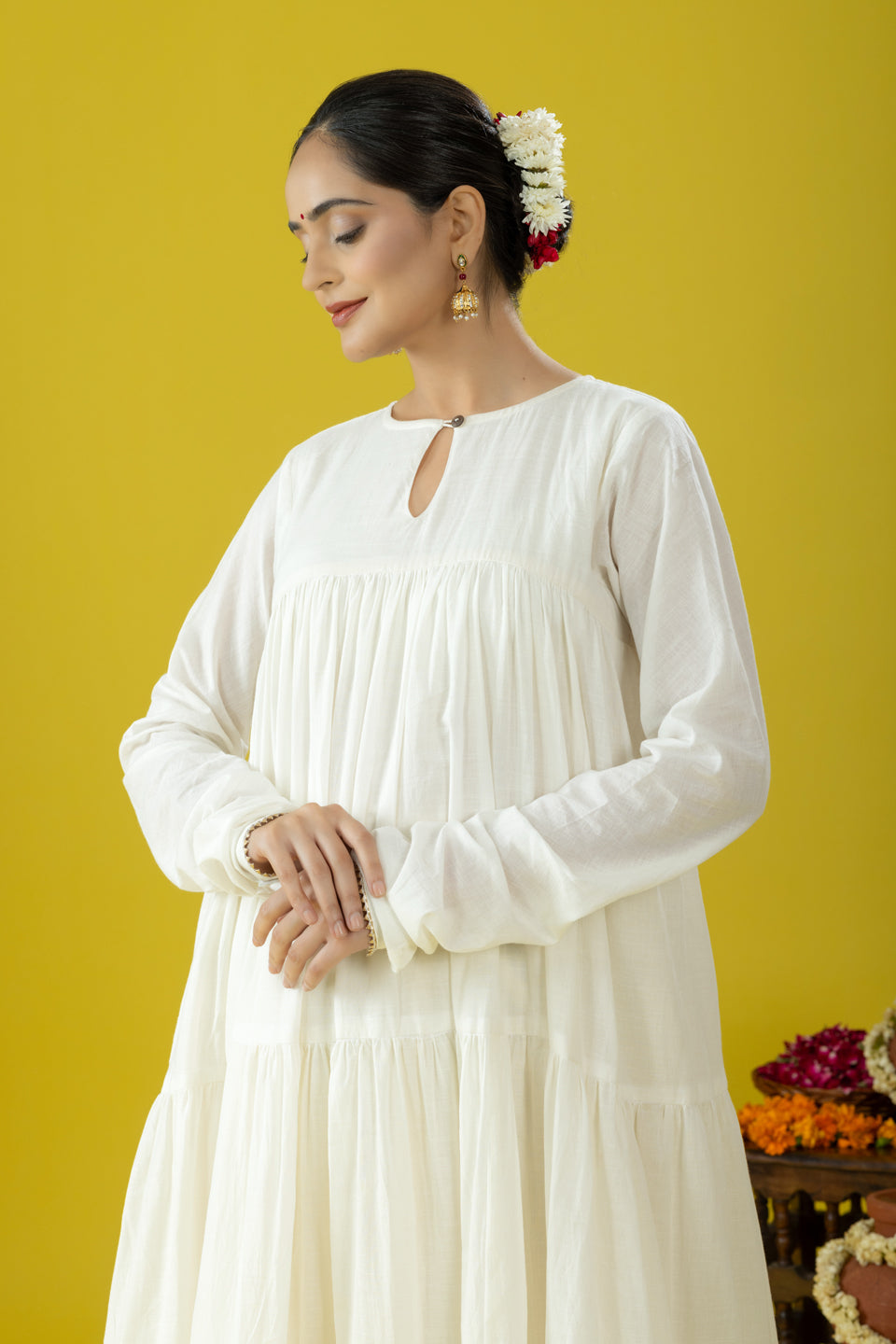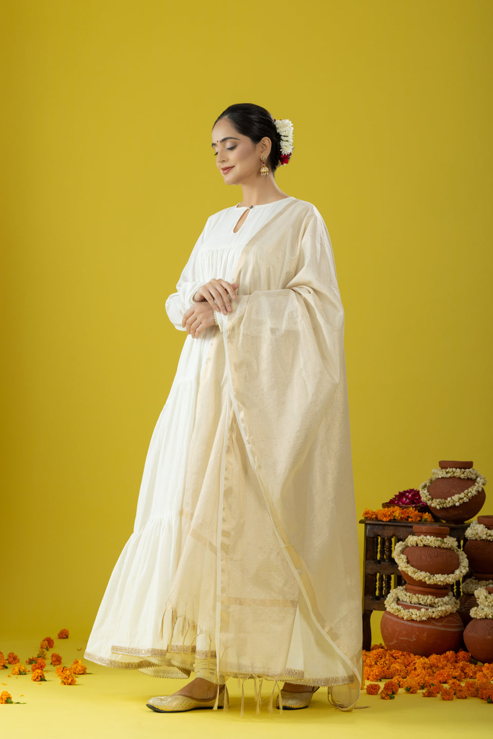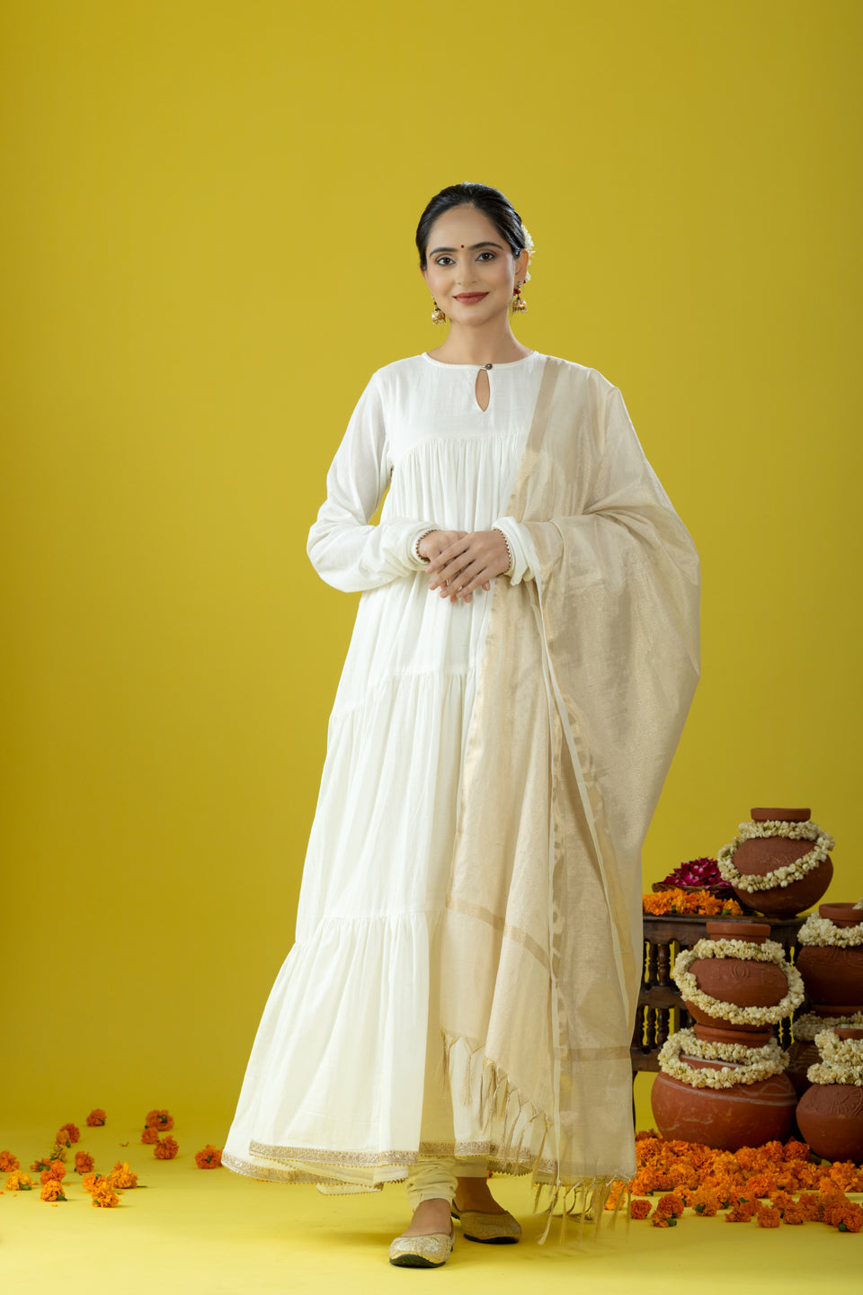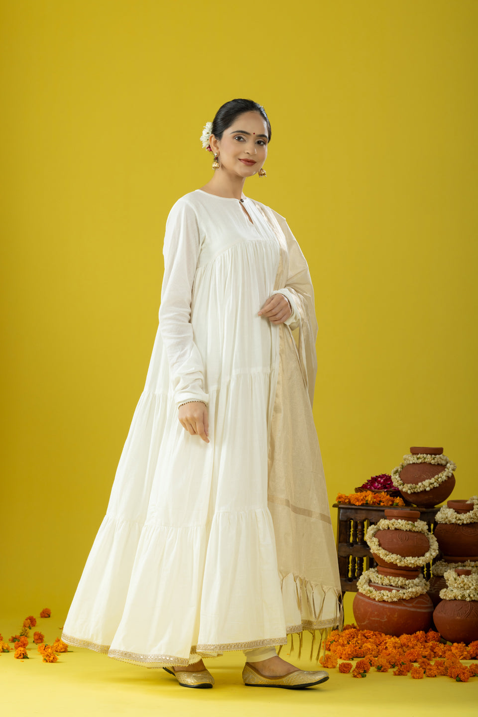 Embrace elegance in our white cotton salwar suit set. Crafted with finesse, our 3-piece ensemble features a round keyhole neck tiered kurta depicting charming minimal embroidery, a pair of churidaar salwar pants, and a stunning white dupatta with gold accents. The luxurious cambric cotton fabric ensures warmth and comfort a contemporary fit which is ideal for day festivities. Prepare to be mesmerized by the delicate churidaar sleeves and the gorgeous flared hemline, both intricately bordered with lace. Style tip: Compliment the ensemble with jewels, a pair of mojaris, and a clutch bag.