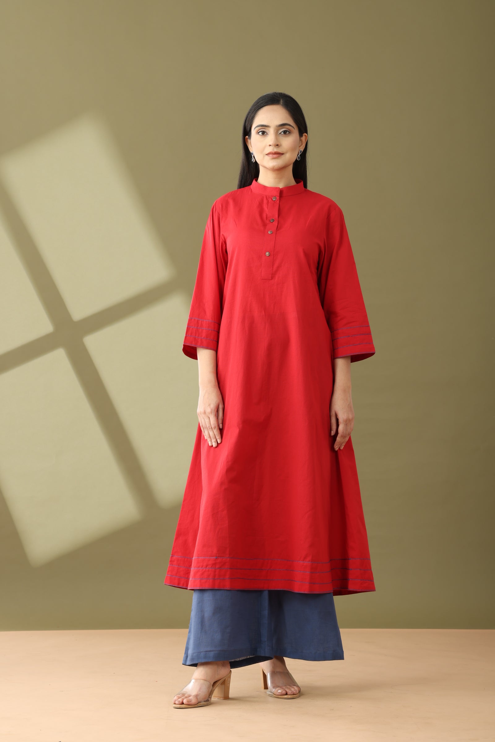 Bold, vibrant, and exotic, our Rumred flared kurta checks all the right boxes for the perfect outfit. Made in cotton cambric, the bright red fabric has running stitch embroidery, on the sleeves and hemline. Extremely soft and comfortable to wear, the kurta comes with wooden functional buttons, band collar and slits along the sleeve cuffs.The chilli red with denim blue is a gorgeous combination and the super-comfy flared silhouette makes it a wardrobe must-have. This is a classic piece that you can accessorize with either oxidised or gold jewelry depending on your mood. Add some heels and you are ready for a day out with friends.