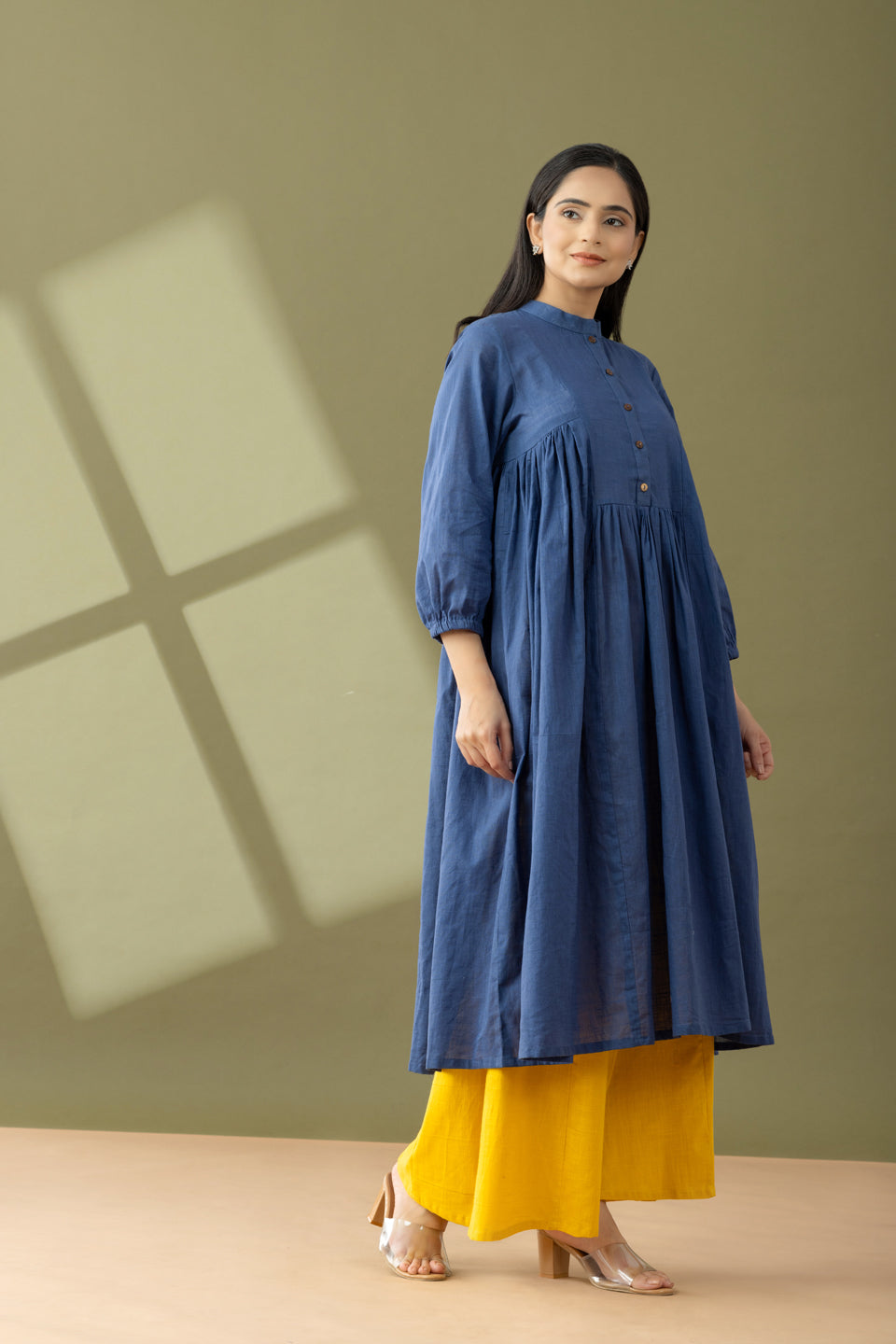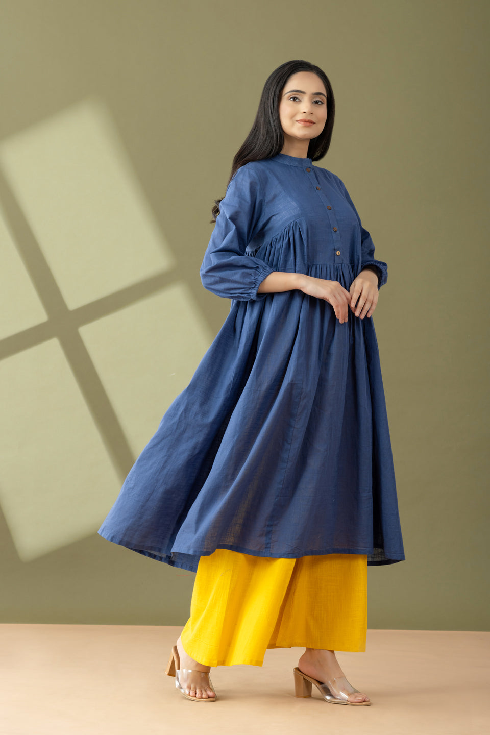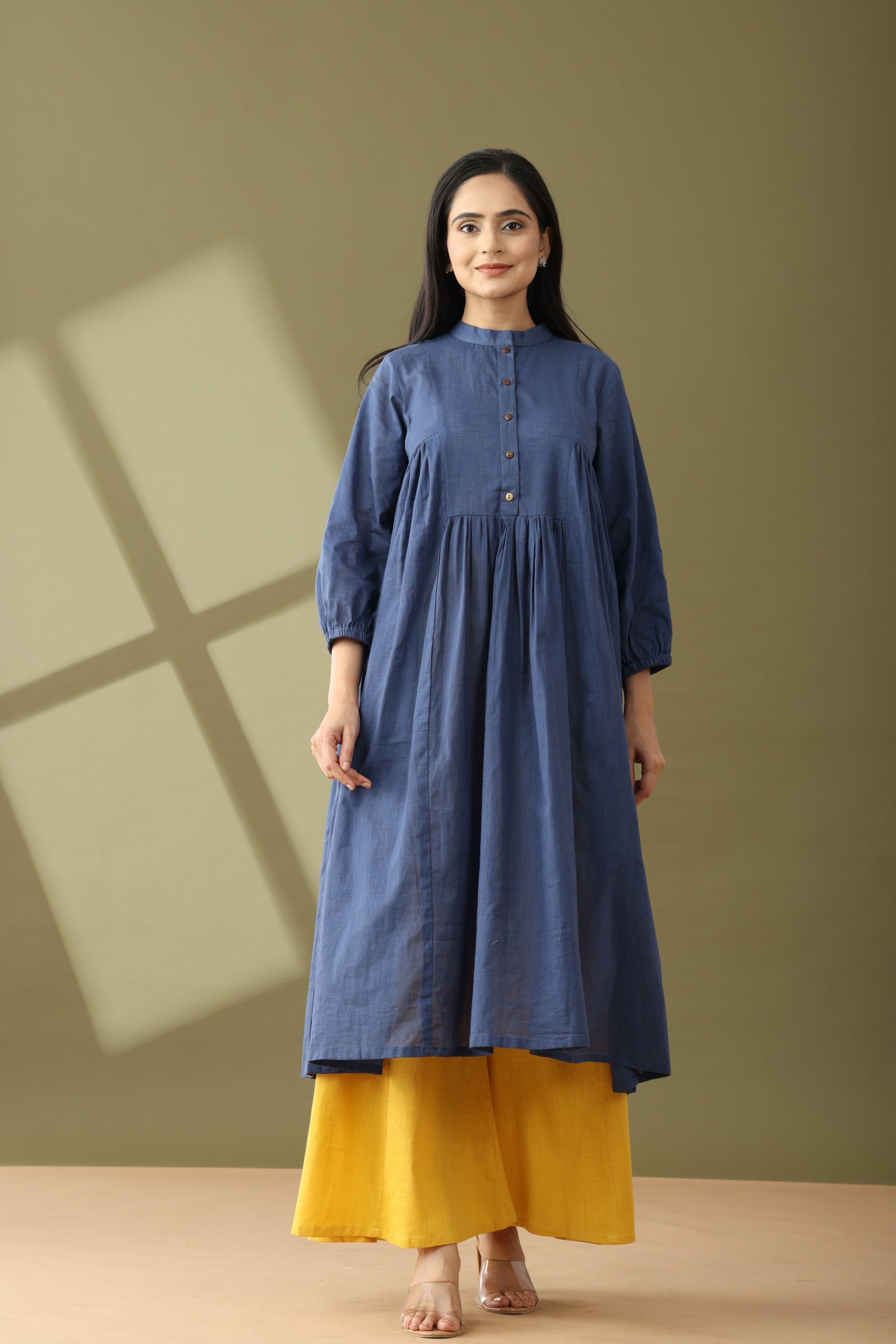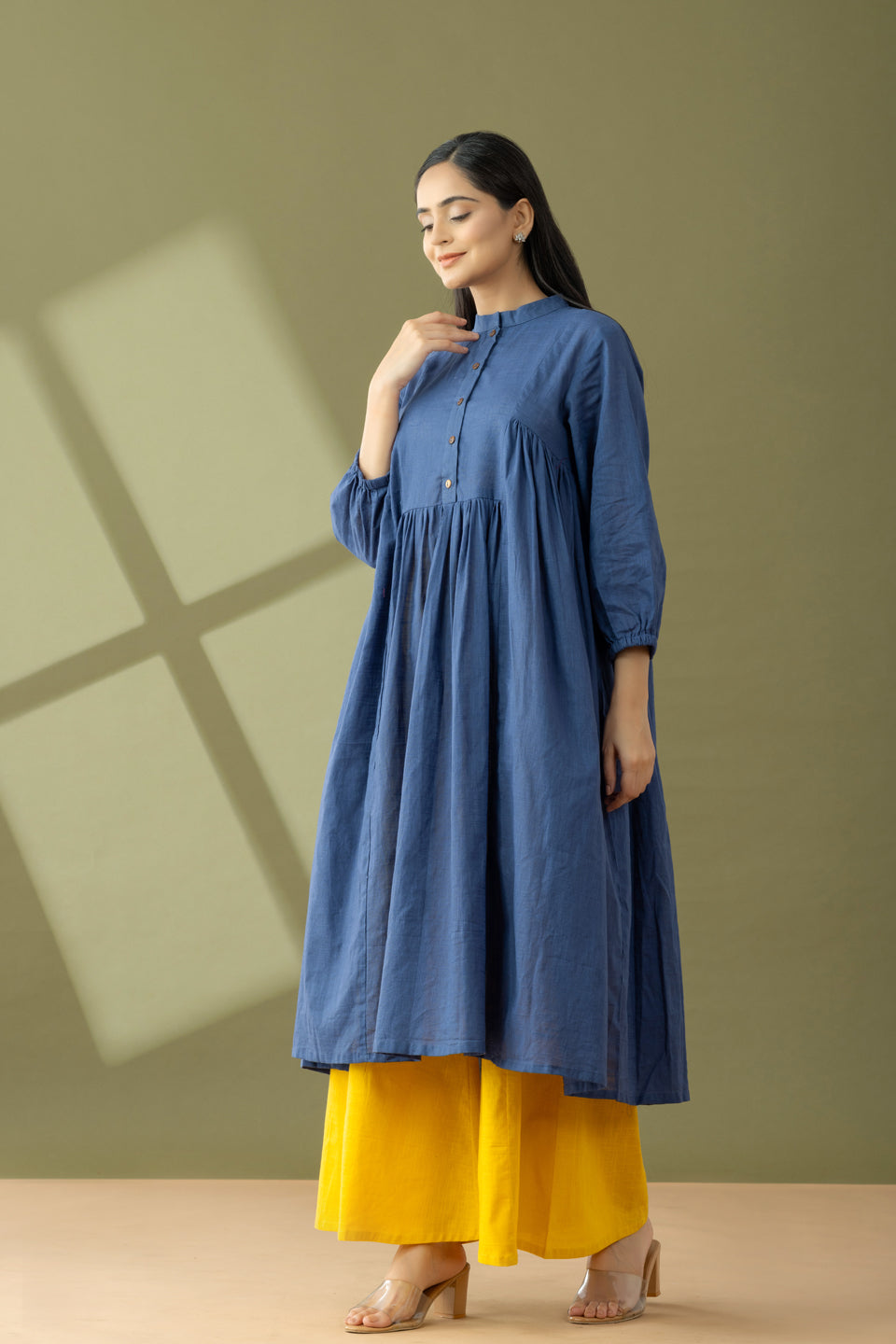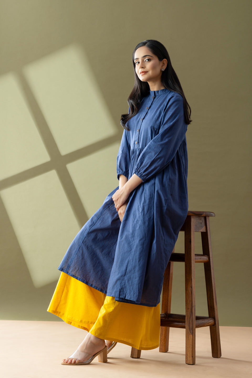 The True Blue Kurta Set blends traditional charm with contemporary style. Featuring a collared, full-sleeve kurta paired with yellow flared palazzos, this set is crafted from luxurious cotton, ensuring comfort throughout the day. The pleats along the front and back are strategically placed to create a breezy silhouette and its denim blue hue provides a versatile base for any casual occasion, promising a refined and understated look. Style this with pair of comfy flats and a brown sling bag to create a stylish casual look.